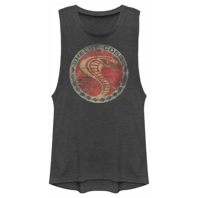 - Strut your stuff with this stylish new everyday juniors’ festival muscle tank top featuring a vintage distressed Shelby Cobra logo printed on the front!