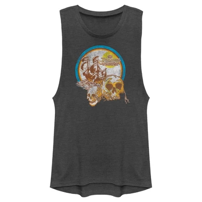 - Strut your stuff with this stylish new every day juniors’ festival muscle tank top that is perfect for every occasion! Featuring the Black Pearl ship, two skulls, and the movie logo in a distressed style.