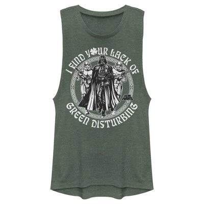 Stop looking for St. Patty’s Day attire in Alderaan places! Add a little out-of-this-world style to your wardrobe with this officially licensed Star Wars St. Patrick’s Day I Find Your Lack of Green Disturbing Juniors’ Festival Muscle Tank Top! This cool design features Darth Vader and two Stormtroopers encircled by “I Find Your Lack Of Green Disturbing.” Get ready to be the center of attention at the St. Patrick’s Day celebration with this epic new Star Wars graphic tank top!