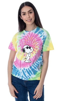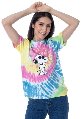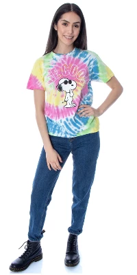 This shirt is an officially licensed Peanuts Snoopy Joe Cool skimmer tee. Joe Cool is one of Snoopy’s alter-egos. He first appeared in a Peanuts comic strip in 1971. As Joe Cool, Snoopy pretends to be a college student. To become Joe Cool, the beagle puts on a pair of sunglasses, leans against a wall, and says his name is Joe Cool. As the name suggests, Joe Cool believes he is really cool, somewhat like James Dean or Fonzie from Happy Days. Joe Cool is printed on the front of the tee with his name Joe Cool arched over him. The skimmer style cut adds a youthful feel, and the tie-dye color spiral makes it far out. Perfect for fans of Peanuts or Snoopy.