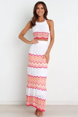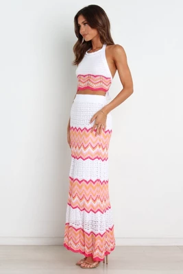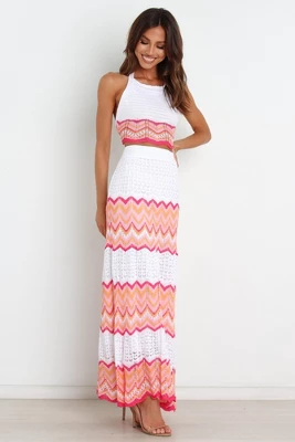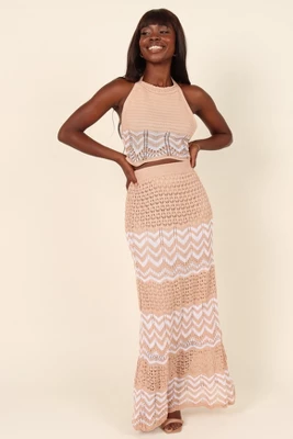 This crop top is perfect for summer days! The crochet knit style gives it a feel while the halter neckline with tie close and open back tie close bring an elegant touch. It’s made of a lightweight, stretch knit fabric so you’ll look great and still be comfortable all day long.