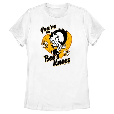 - Strut your stuff with this stylish new women’s t-shirt that is perfect for Valentine’s Day! Featuring Betty Boop in front of a honeycomb heart with bees and the phrase: “You’re the Bee’s Knees,” across the front.