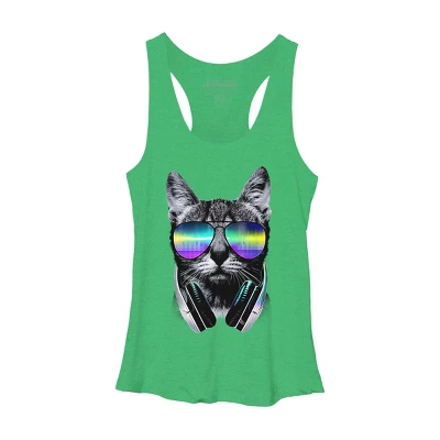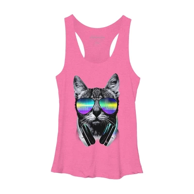 - This feline good design features a DJ tabby cat wearing headphones and cool sunglasses reflecting colorful music beats.