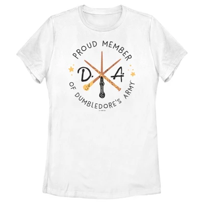 - Strut your stuff with this stylish new women’s t-shirt featuring a cool graphic showing off your alliance with Dumbledore’s army!
