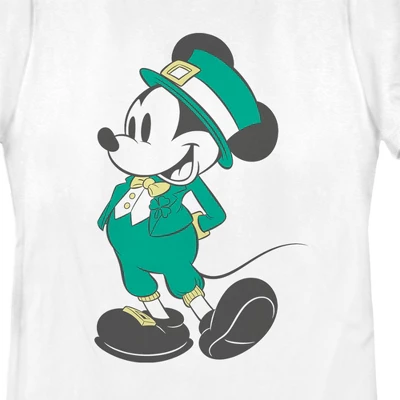 - Strut your stuff with this stylish new women’s t-shirt that is perfect for St. Patrick’s Day celebrations! Featuring a large graphic of Mickey Mouse dressed up in a leprechaun printed costume across the front.
